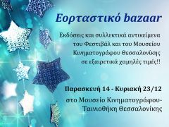 Εν όψει των εορτών, το Φεστιβάλ Κινηματογράφου Θεσσαλονίκης διοργανώνει στο πωλητήριό του, στους χώρους του Μουσείου Κινηματογράφου – Ταινιοθήκης Θεσσαλονίκης, bazaar βιβλίων και αντικειμένων, δίνοντας την ευκαιρία στους σινεφίλ να εμπλουτίσουν την κινηματογραφική τους βιβλιοθήκη και να αποκτήσουν συλλεκτικά αντικείμενα σε εξαιρετικά χαμηλές τιμές.