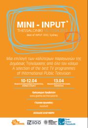 Το Φεστιβάλ Κινηματογράφου Θεσσαλονίκης, η Δημοτική Τηλεόραση Θεσσαλονίκης TV 100, το Δίκτυο Επιμορφωτικών Ινστιτούτων Eunic Greece Thessaloniki, το Ινστιτούτο Γκαίτε Θεσσαλονίκης και η INPUT (International Public Television) συνδιοργανώνουν φέτος για δεύτερη χρονιά στη Θεσσαλονίκη το συνέδριο Mini-INPUT, φέρνοντας σε επαφή το κοινό της πόλης με τις καλύτερες στιγμές του INPUT 2012 του Σίδνεϋ.