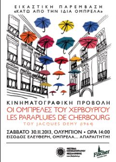 Με αφορμή τα «αποκαλυπτήρια» της καλλιτεχνικής παρέμβασης, θα γίνει προβολή της ταινίας Οι Ομπρέλες του Χερβούργου / The Umbrellas of Cherbourg* του Ζακ Ντεμί / Jacques Demy (1964) το μεσημέρι του Σαββάτου, 30 Νοεμβρίου στις 14.00 στο Ολύμπιον. Η είσοδος είναι ελεύθερη... η ομπρέλα απαραίτητη!