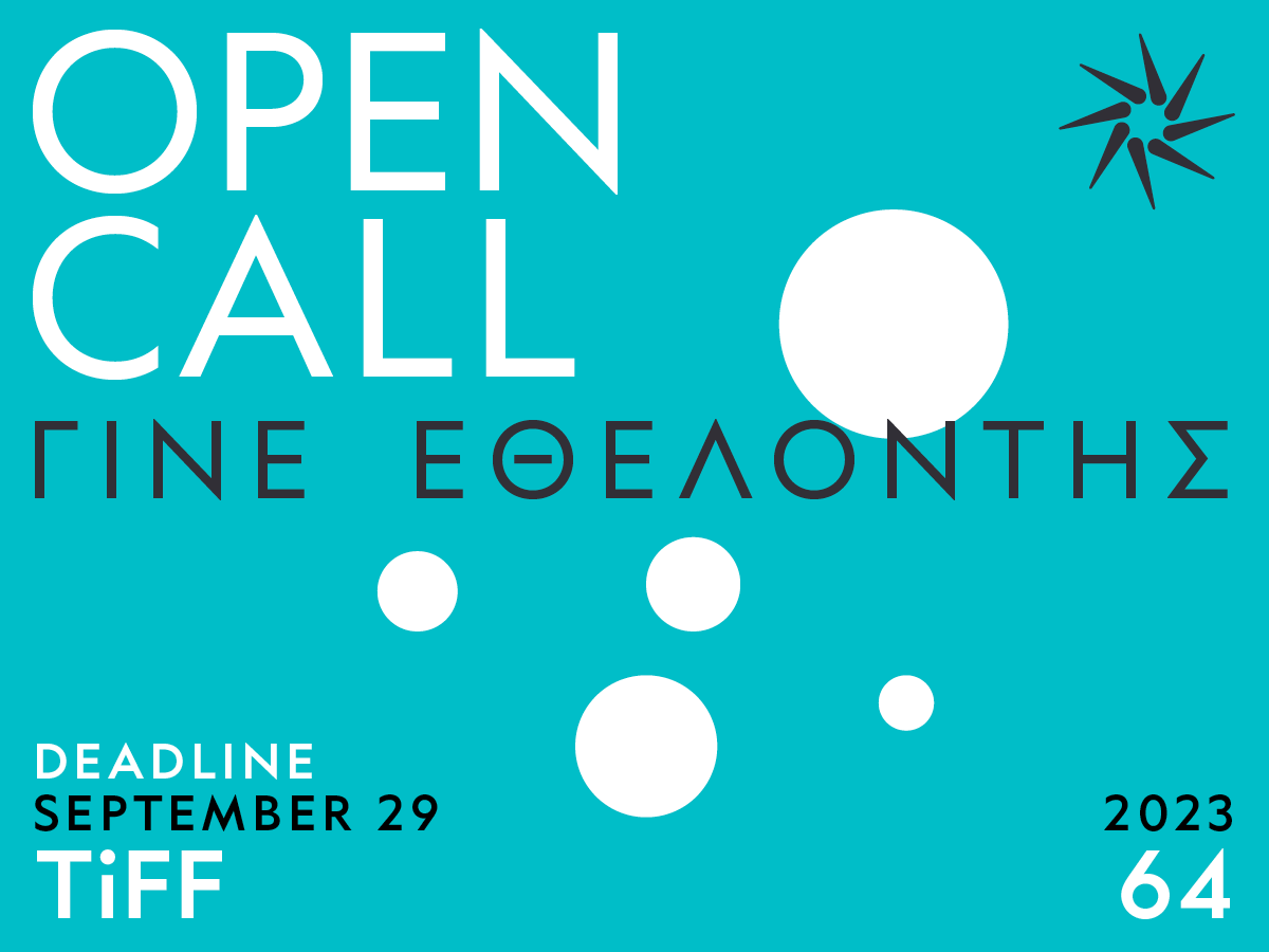 Το Φεστιβάλ Κινηματογράφου Θεσσαλονίκης απευθύνει Πρόσκληση Ενδιαφέροντος σε άτομα ηλικίας άνω των 18 ετών για την προσφορά της εθελοντικής τους απασχόλησης κατά τη διεξαγωγή του 64ου Φεστιβάλ Κινηματογράφου Θεσσαλονίκης, που θα πραγματοποιηθεί στη Θεσσαλονίκη από την 2η έως και την 12η Νοεμβρίου 2023 και καλεί τους ενδιαφερόμενους να καταθέσουν τις αιτήσεις τους σε ηλεκτρονική μορφή στην ηλεκτρονική διεύθυνση που αναφέρεται κατωτέρω.