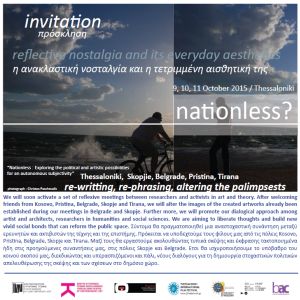 Το Φεστιβάλ Κινηματογράφου Θεσσαλονίκης υποστηρίζει το διαβαλκανικό πρότζεκτ του Πανεπιστημίου Μακεδονίας με τίτλο «nationless? Η ανακλαστική νοσταλγία και η τετριμμένη αισθητική της» και φιλοξενεί τις εργασίες του την Κυριακή 11 Οκτωβρίου 2015 στο Μουσείο Κινηματογράφου – Ταινιοθήκη Θεσσαλονίκης (Αποθήκη Α΄, Λιμάνι, τηλ. 2310-508398).