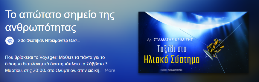 Που βρίσκεται το Voyager; Μάθετε τα πάντα για το διάσημο διαπλανητικό διαστημόπλοιο το Σάββατο 3 Μαρτίου, στις 20:00, στο Ολύμπιον, στην ειδική προβολή του ντοκιμαντέρ Το απώτατο σημείο της ανθρωπότητας της Έμερ Ρέινολντς. Μετά την προβολή, θα συζητήσουμε με τον πολυβραβευμένο διαστημικό επιστήμονα και μέλος της Ακαδημίας Αθηνών Δρ. Σταμάτη Κριμιζή, σημαντικό στέλεχος της NASA, ο οποίος έχει συμμετάσχει σε αποστολές προς όλους τους πλανήτες του Ηλιακού Συστήματος. Τη συζήτηση θα συντονίσει ο δημοσιογράφος Μάκης Προβατάς. Η ταινία θα βγει στις ελληνικές αίθουσες στις 26 Απριλίου 2018 από την εταιρεία διανομής Filmtrade.