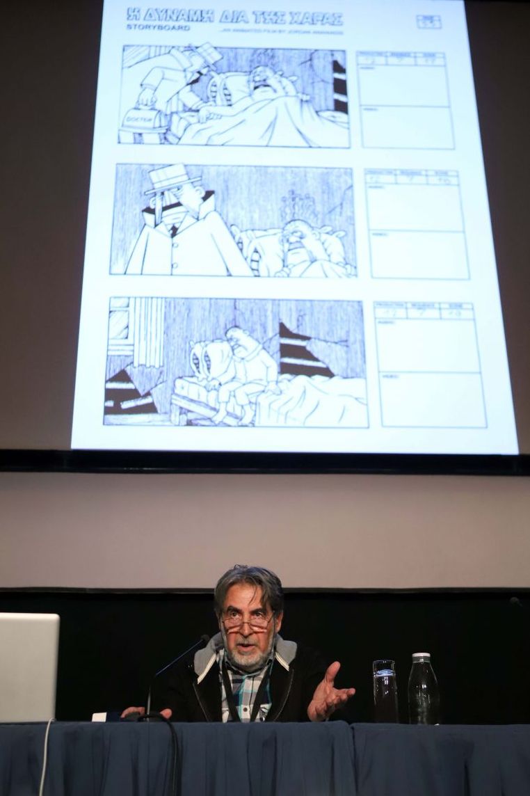 Ο δημιουργός παρουσίασε με συνοπτικό τρόπο τους βασικούς άξονες στην τεχνική του, ενώ μίλησε τόσο για την καλλιτεχνική αξία των ταινιών animation όσο και για τον κομβικό τους ρόλο στα live action φιλμ. «Η σχέση μεταξύ των ειδικών εφέ και του animation είναι καθοριστικής σημασίας. Επί της ουσίας, πίσω από τα περισσότερα ειδικά εφέ που βλέπουμε στο σινεμά, βρίσκονται animators. Οτιδήποτε λειτουργεί με τη λογική καρέ-προς-καρέ υπάγεται στη γενική κατηγορία του κινουμένου σχεδίου», διευκρίνισε σχετικά. Αναφορικά με την καθοριστική λειτουργία του storyboard, σημείωσε: «Το storyboard είναι μια μορφή οπτικοποιημένης γραφής, είναι η οπτική αποτύπωση του κινηματογραφικού σεναρίου. Κατά τη γνώμη μου, η εκ των προτέρων απόπειρα οπτικοποίησης του σεναρίου συνιστά θεμέλιο λίθο των πρώτων σταδίων μιας κινηματογραφικής παραγωγής. Δυστυχώς, στον σύγχρονο κινηματογράφο και ειδικά στη χώρα μας, η οπτικοποίηση του σεναρίου ξεκινά να παίρνει σάρκα και οστά χωρίς καμία προεργασία». Υπογράμμισε ότι το storyboard είναι το εργαλείο προκειμένου να αποτυπωθεί η συναισθηματική εξέλιξη των χαρακτήρων, λειτουργώντας υποβοηθητικά για όλα τα επιμέρους στοιχεία μιας ταινίας: «Μάλιστα, στις πιο προηγμένες κινηματογραφικές βιομηχανίες, αλλά και στον χώρο της διαφήμισης, πολλές φορές το storyboard αγγίζει την τελειότητα, σχεδόν αποκτώντας χροιά αυτόνομου έργου τέχνης». Σ αυτό το σημείο έκανε μνεία στον θρυλικό σκηνοθέτη Σεργκέι Αϊζενστάιν, ο οποίος ζωγράφιζε αμέτρητες παραλλαγές από τα πρόσωπα των βασικών χαρακτήρων κάθε του ταινίας, προτού ξεκινήσει τα γυρίσματα, χρησιμοποιώντας ένα πρώιμο storyboard, στο οποίο είχε αποδώσει τον χαρακτηρισμό “οπτική γραμματική”.