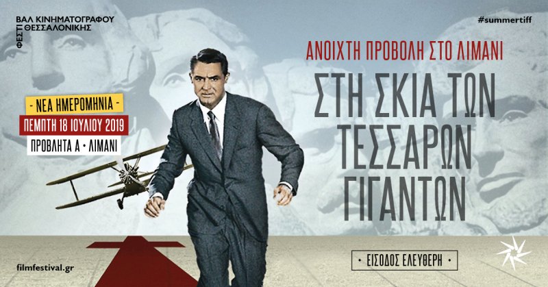 Σασπένς από την πρώτη ως την τελευταία σκηνή, αγωνία στο κόκκινο, καταιγιστικός ρυθμός, δηλητηριώδες χιούμορ. Η πιο συναρπαστική, διασκεδαστική και θεαματική ταινία του Άλφρεντ Χίτσκοκ, το αριστουργηματικό Στη σκιά των τεσσάρων γιγάντων, ένα εντυπωσιακό κυνηγητό από τη Νέα Υόρκη στο όρος Ράσμορ με πρωταγωνιστή τον Κάρι Γκραντ, είναι η ταινία της ανοιχτής προβολής του Φεστιβάλ Κινηματογράφου Θεσσαλονίκης. Η κατασκοπευτική περιπέτεια του ιδιοφυούς σκηνοθέτη μετατρέπεται σε αξέχαστη κινηματογραφική εμπειρία με ελεύθερη είσοδο, την Πέμπτη 18 Ιουλίου 2019, σε ένα από τα πιο αγαπημένα σημεία της Θεσσαλονίκης, στην Προβλήτα Α΄, στο Λιμάνι της πόλης.