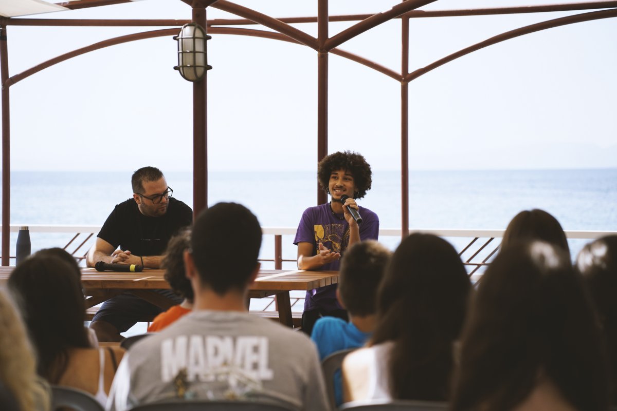 O 17χρονος σκηνοθέτης, σεναριογράφος, ηθοποιός, μουσικός, χορογράφος και μαθητής Λυκείου Πάμπλο Σότο Γκονζάλες και ο Μανώλης Μελισσουργός, καλλιτεχνικός διευθυντής της Κάμερα Ζιζάνιο του Διεθνούς Φεστιβάλ Κινηματογράφου Ολυμπίας για Παιδιά και Νέους, μίλησαν σε μαθητές για το πώς μπορείς να γράψεις, να σκηνοθετήσεις και να προωθήσεις μια ταινία.