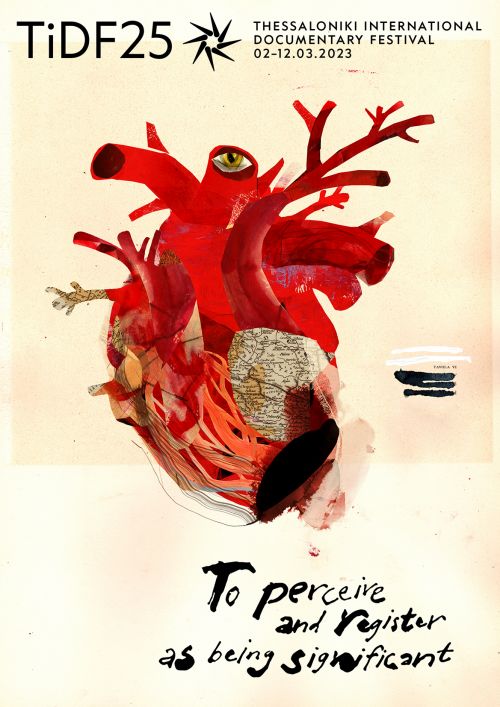 For the poster of the 25th Thessaloniki International Documentary Festival, we asked the artist to draw inspiration from the heart, our inner map and eyes in a world that is constantly getting bigger and smaller at the same time. In cinema, as well as in the arts as a whole, the heart stands as an ever-lasting symbol, a reminder of the human condition, whether filled with joy or broken in pieces.